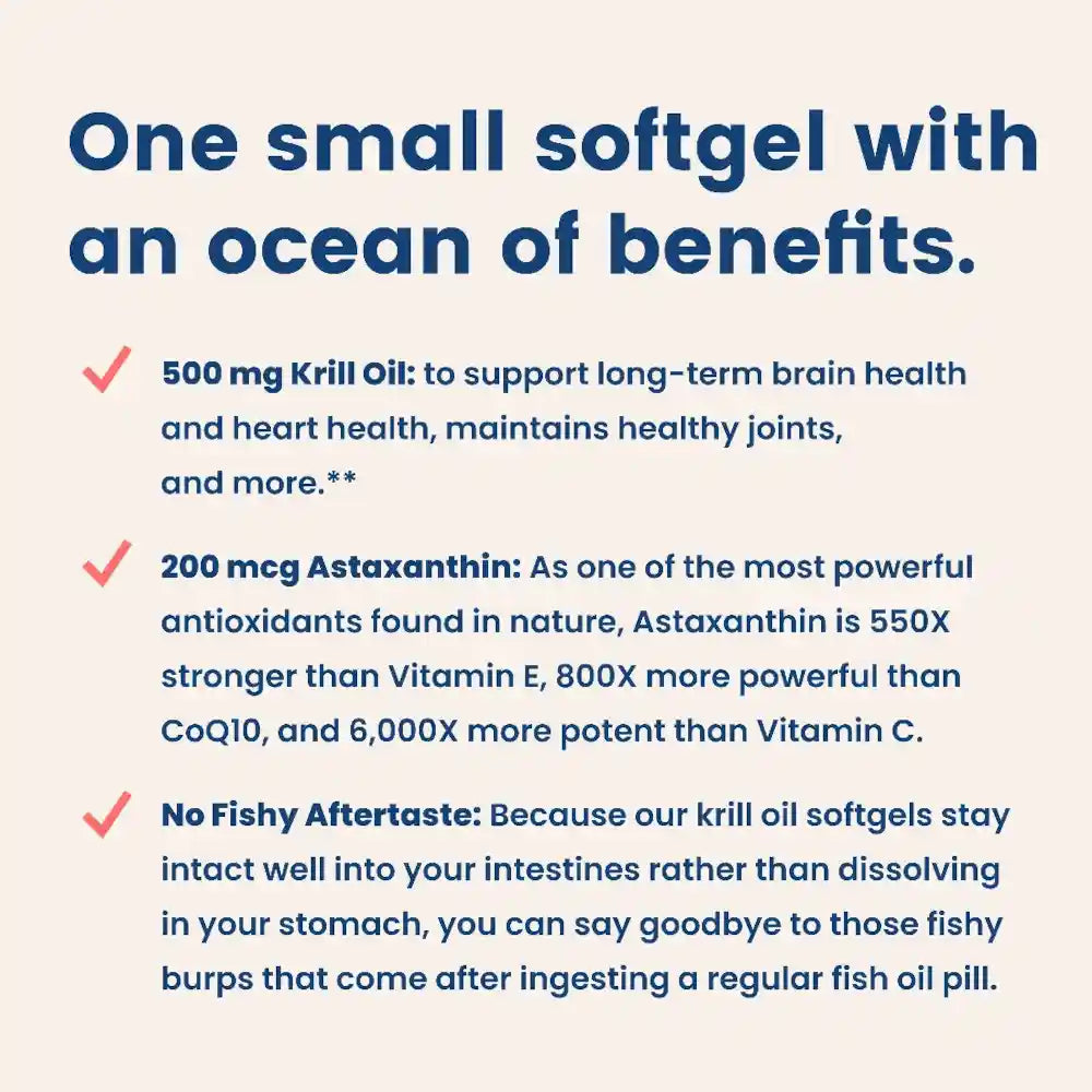 - 500 mg Wild-Caught Krill Oil: Our wild-caught Krill Oil helps you support long-term brain health and heart health, maintains healthy joints, and more.**