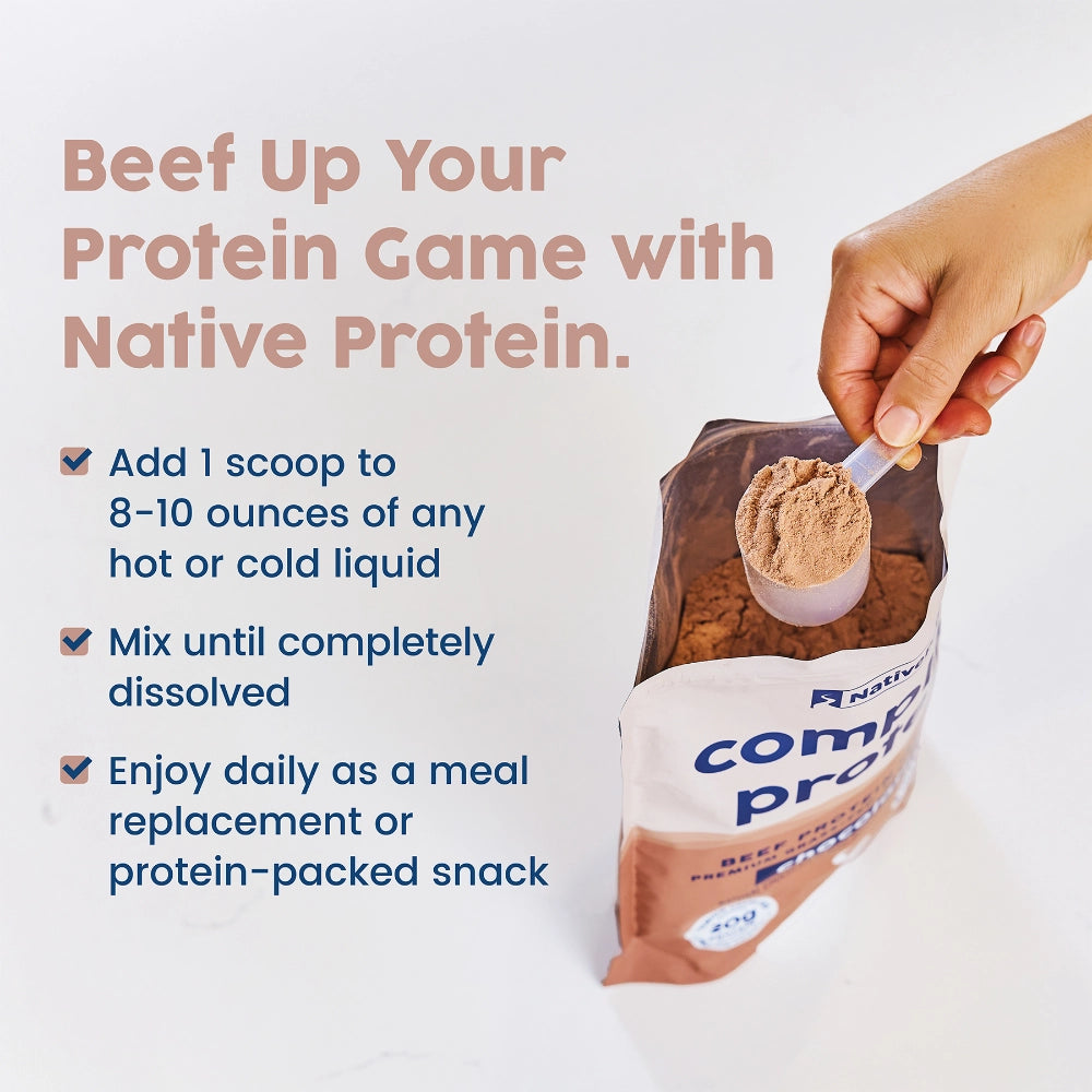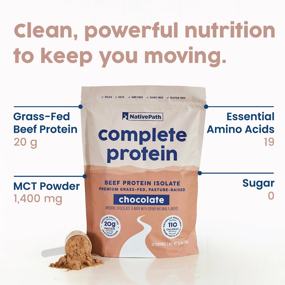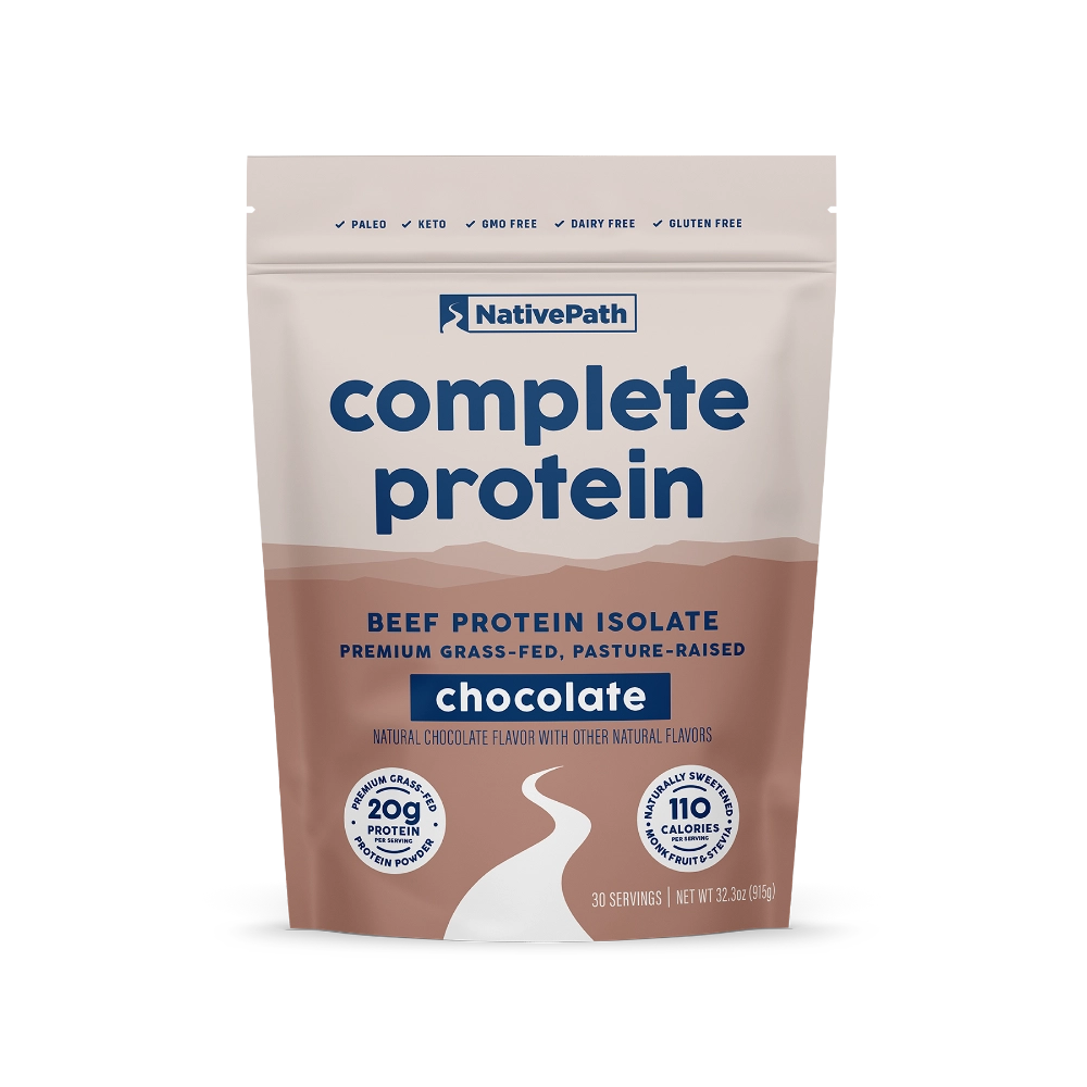 NativePath Complete Protein is 97% hormone-free protein made from grass-fed EU-origin cows. With 20 grams of high-quality protein and 19 essential amino acids in each scoop, Native Protein is ideal as a stand-alone protein or primary protein driver in meal replacements. Use Native Complete Protein to help promote muscle mass, recovery, bone health, and weight management.†