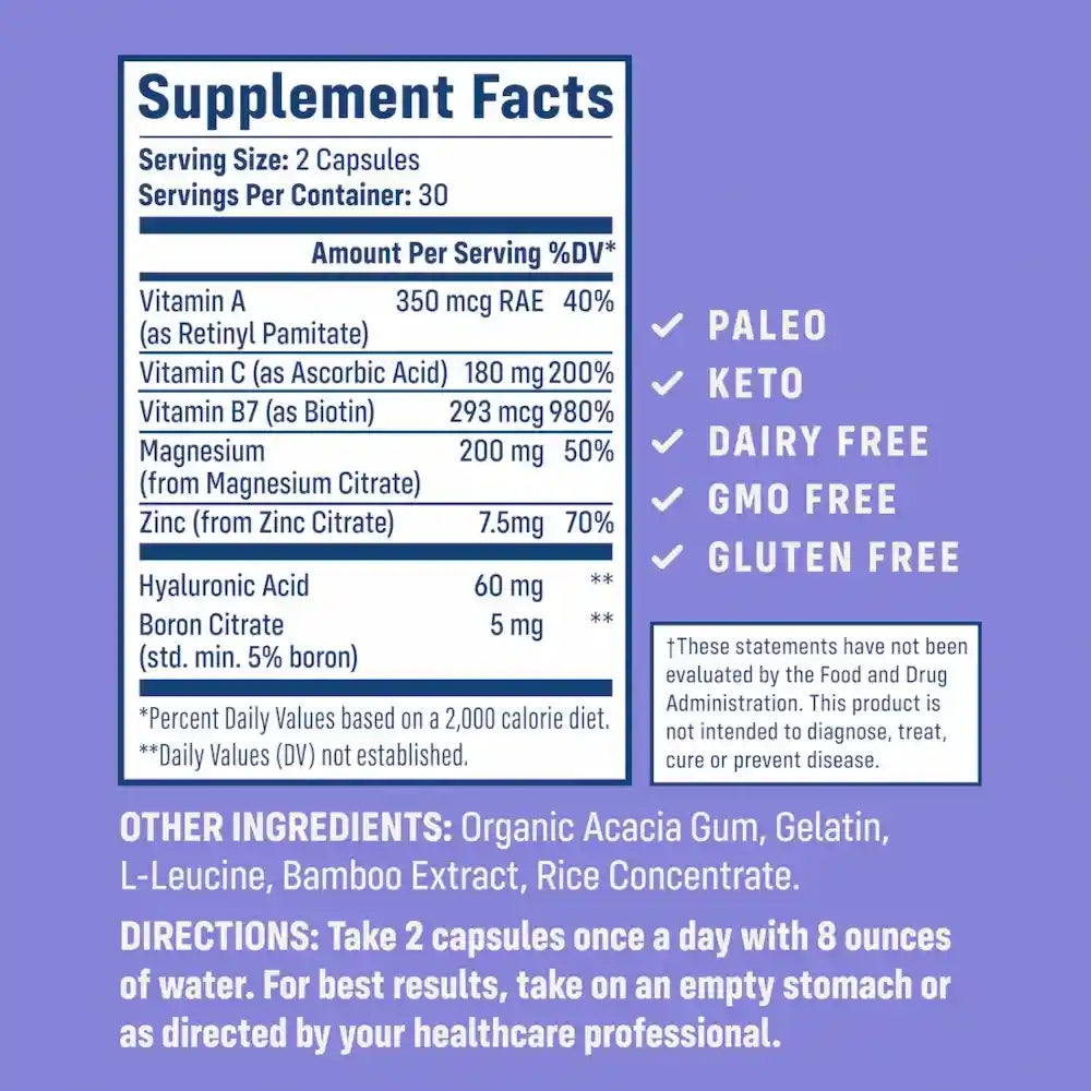 Collagen Care+ is formulated with 5 essential vitamins and minerals—plus Hyaluronic Acid and Boron—to boost the results of your collagen supplementation. It does this in 3 important ways: