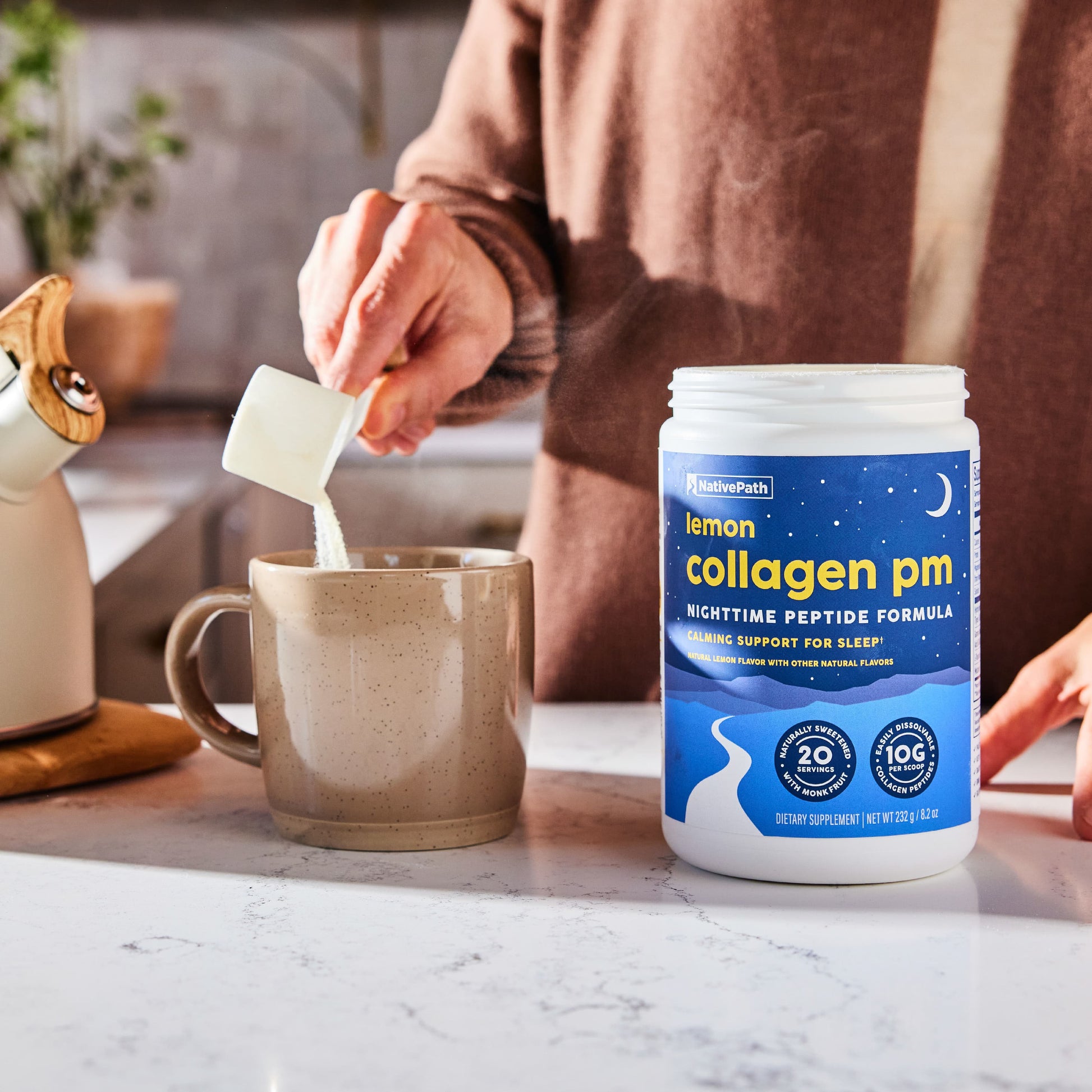 Drift to sleep with our peaceful, calming blend of soothing lemon. Collagen PM Nighttime Peptide Formula uses natural ingredients to help calm your mind and body to promote restful sleep. Each serving contains 10 grams of our signature Type 1 and 3 Collagen blend for complete whole-body recovery.
