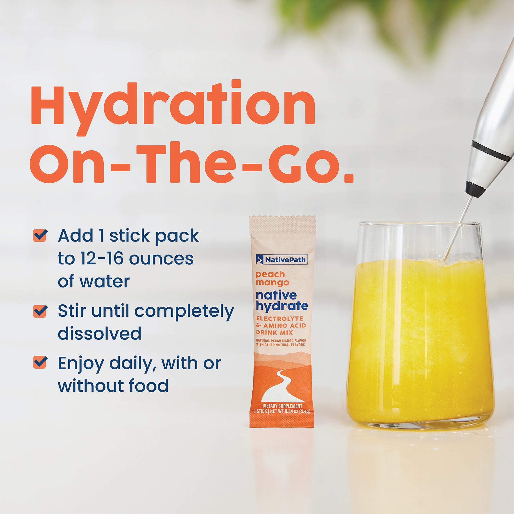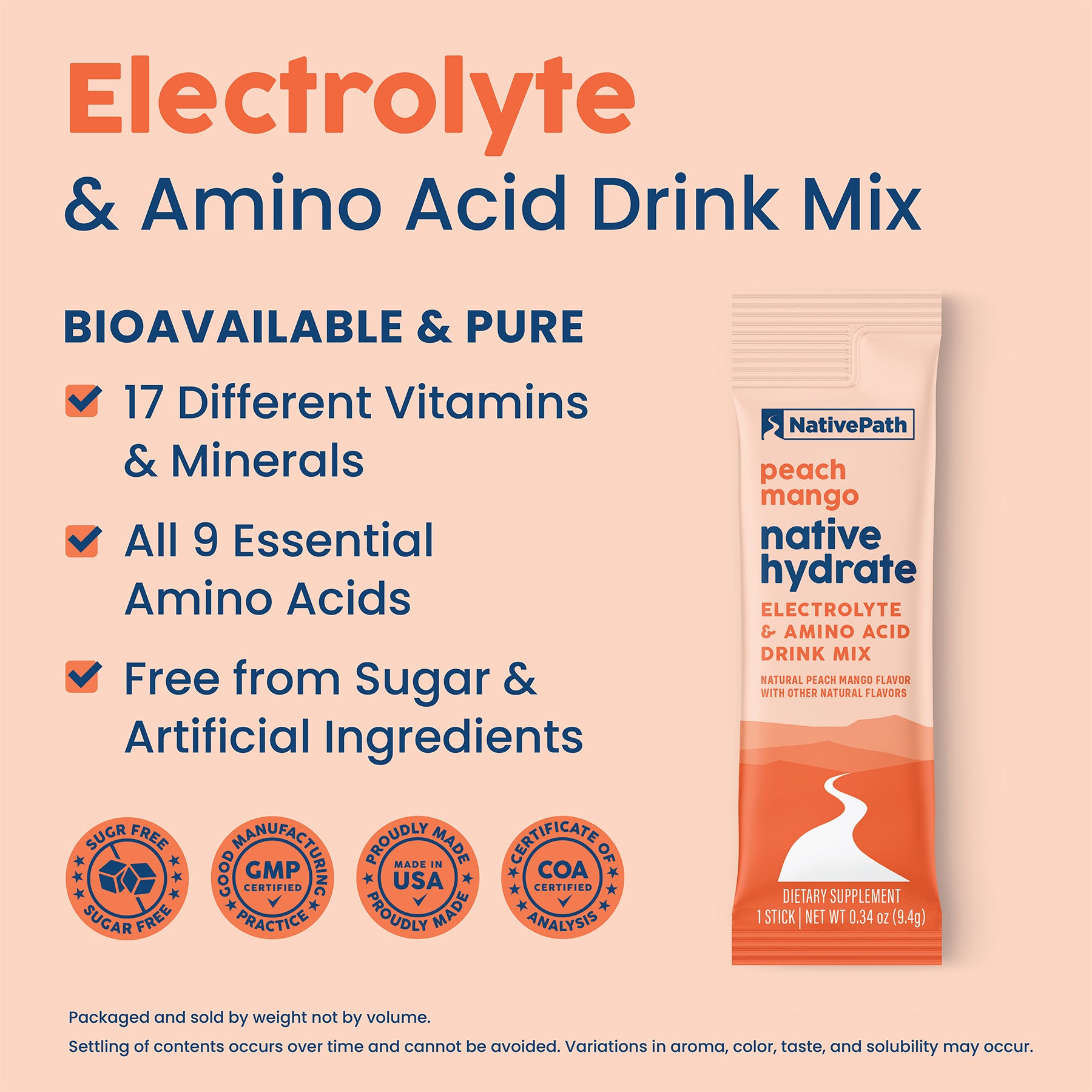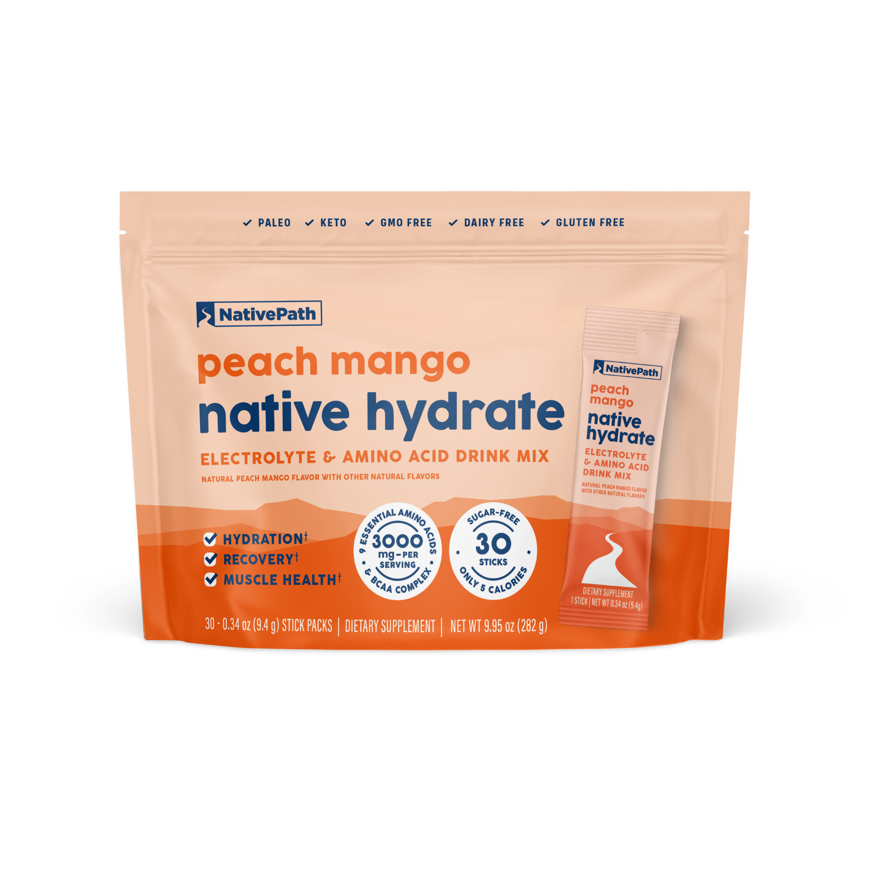 Native Hydrate is a zero-sugar electrolyte and BCAA drink mix that supports hydration, energy, and muscle health.† It combines 14 vitamins and minerals, all 9 essential amino acids, and 2,000 mg of BCAAs into one convenient scoop. Simply add to water and enjoy.
